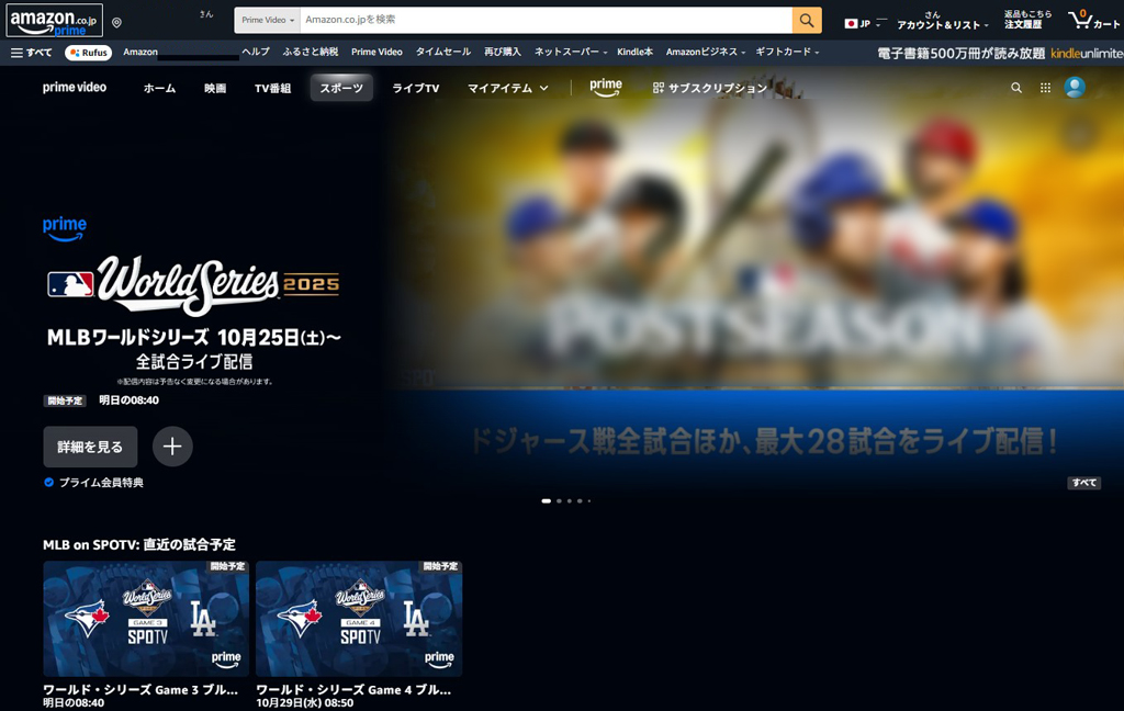 AmazonPrimeの会員であれば、AmazonPrimeVideoのSportから動画視聴ができ、さらにアーカイブも残っているので、見逃していたワールドシリーズの試合についても視聴が可能です。