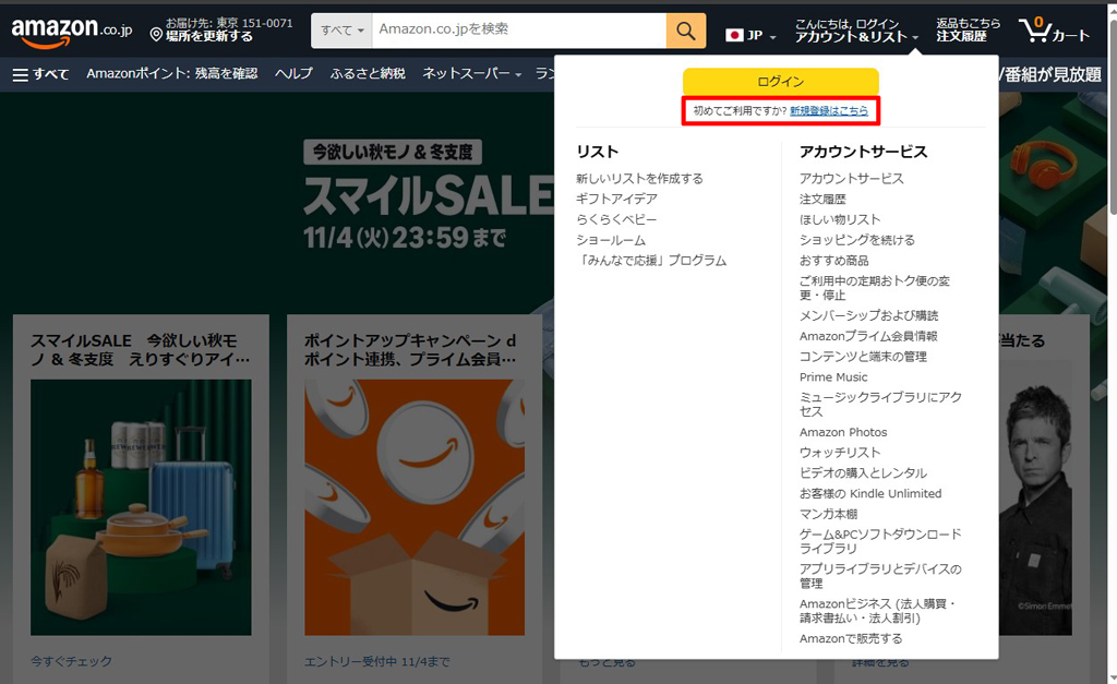 最初にAmazonの会員登録が必要となりますので、会員登録をまだされていない人は、https://www.amazon.co.jp/ (Amazonのサイト)にて会員登録をする必要があります。