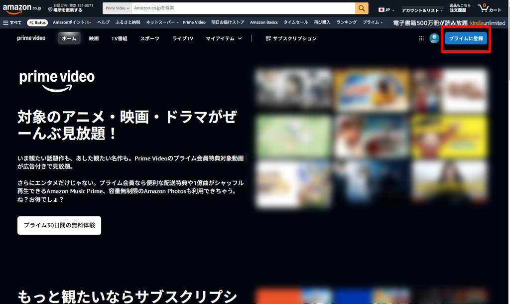 会員登録後、Prime Videoの「プライムに登録」をクリック(タップ)する