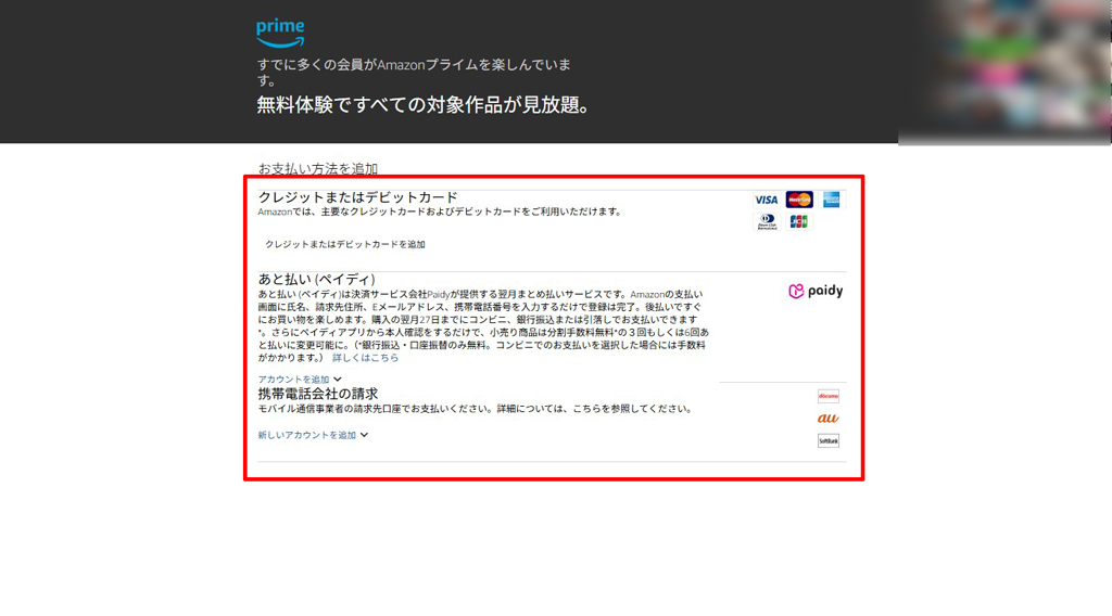 「プライムに登録」をクリック(タップ)すると、決済方法を選択し登録をする